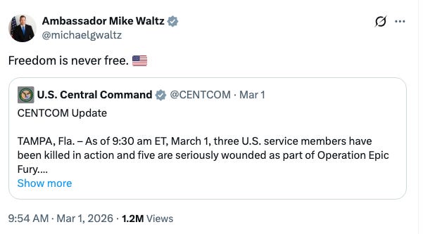 “Freedom is never free,” Mike Waltz brand-tested on X. (This is the same Mike Waltz who defines freedom as sharing a top-secret Signal chat with an Atlantic journalist, so we already got a shaky starting point.)