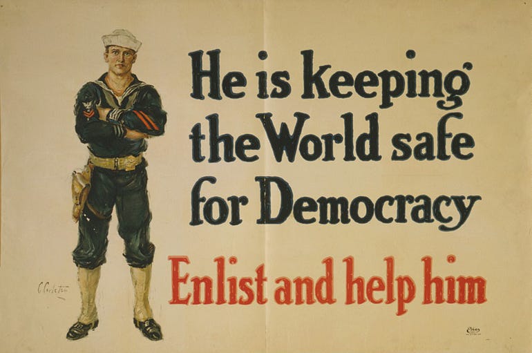Woodrow Wilson campaigned in 1916 on “He Kept Us Out of War.” And then, after his reelection, he turned around and asked Congress to declare war to save democracy worldwide.